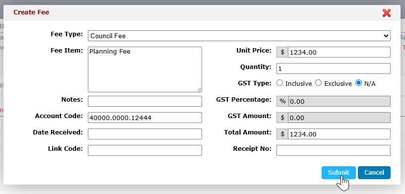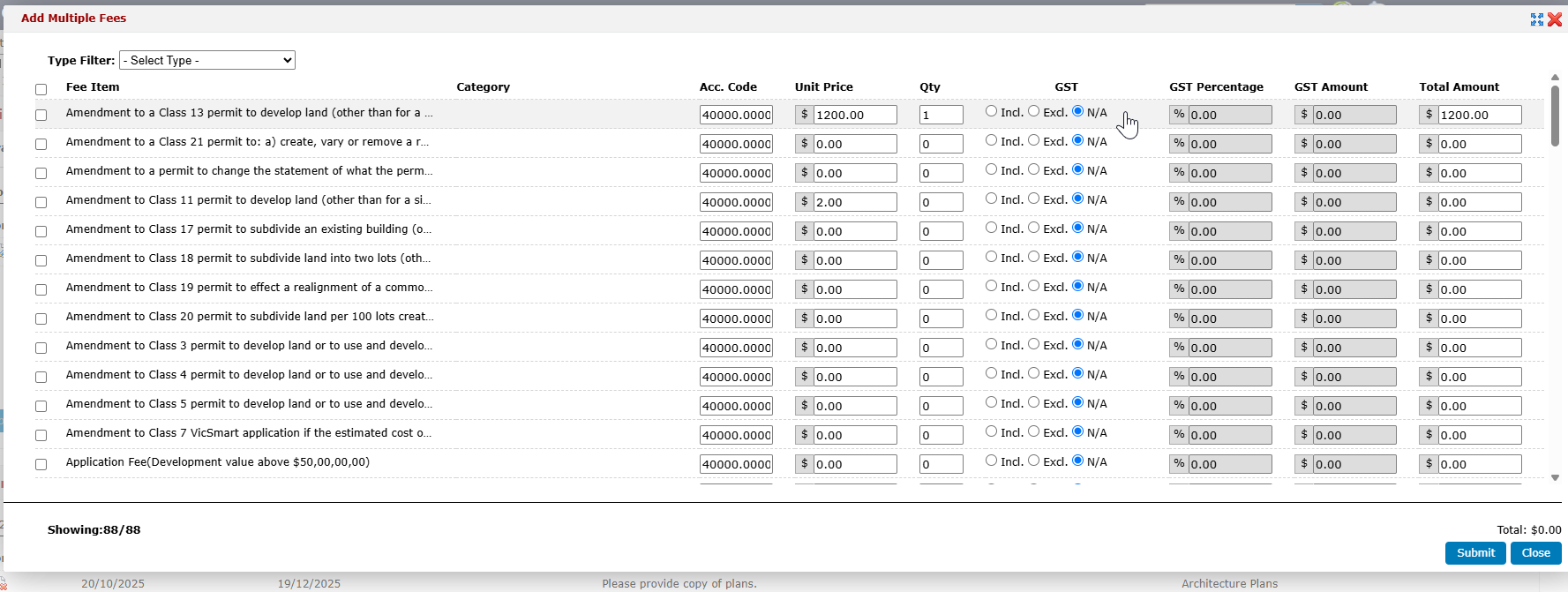 Select the applicable fees and click on submit